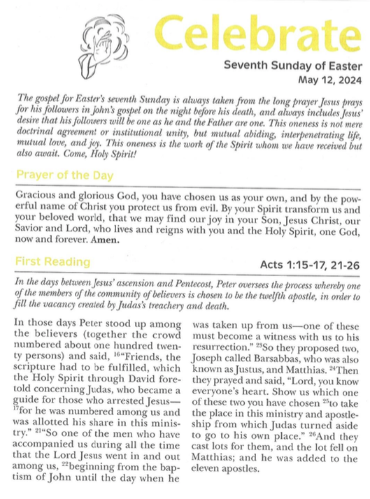Usage Note: In order to view the recorded service and the Bulletin/Celebrate insert at the same time, right click on the above link and select ‘Open Link in New Window’. Once the new window appears, click the triangular start button to begin playing the recording. Then return to this window to view the Bulletin or Celebrate as needed. You can resize and/or reposition either/both windows as needed to view both at the same time