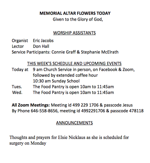 Usage Note: In order to view the recorded service and the Bulletin/Celebrate insert at the same time, right click on the above link and select ‘Open Link in New Window’. Once the new window appears, click the triangular start button to begin playing the recording. Then return to this window to view the Bulletin or Celebrate as needed. You can resize and/or reposition either/both windows as needed to view both at the same time