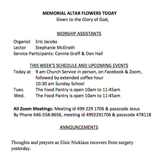 Usage Note: In order to view the recorded service and the Bulletin/Celebrate insert at the same time, right click on the above link and select ‘Open Link in New Window’. Once the new window appears, click the triangular start button to begin playing the recording. Then return to this window to view the Bulletin or Celebrate as needed. You can resize and/or reposition either/both windows as needed to view both at the same time